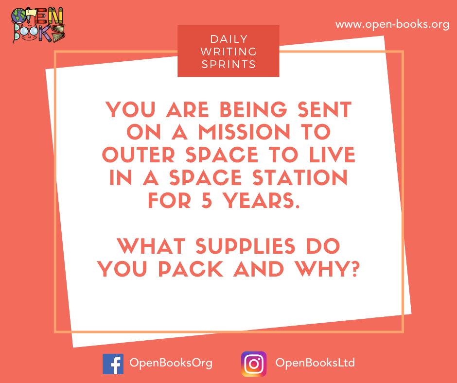 Just like athletes, writers like you need to practice to stay sharp! Open Books is here to help you stay in tip top writing shape and flex your creativity muscles with our Daily Writing Sprint Prompts. A Writing Sprint is a short exercise that challenges you to be as creative as you can with as few limits as possible! We will post a writing prompt everyday so make sure you keep an eye out so you don’t miss any!