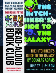 Read-Aloud Book Club will be taking it’s summer selections from the PBS #GreatAmericanRead list. The Hitchhiker’s Guide to the Galaxy by Douglas Adams will be their selection for Wednesday, June 27 at 6:15 PM at Open Books West Loop. Come be a reader or sit & listen then join in the discussion.