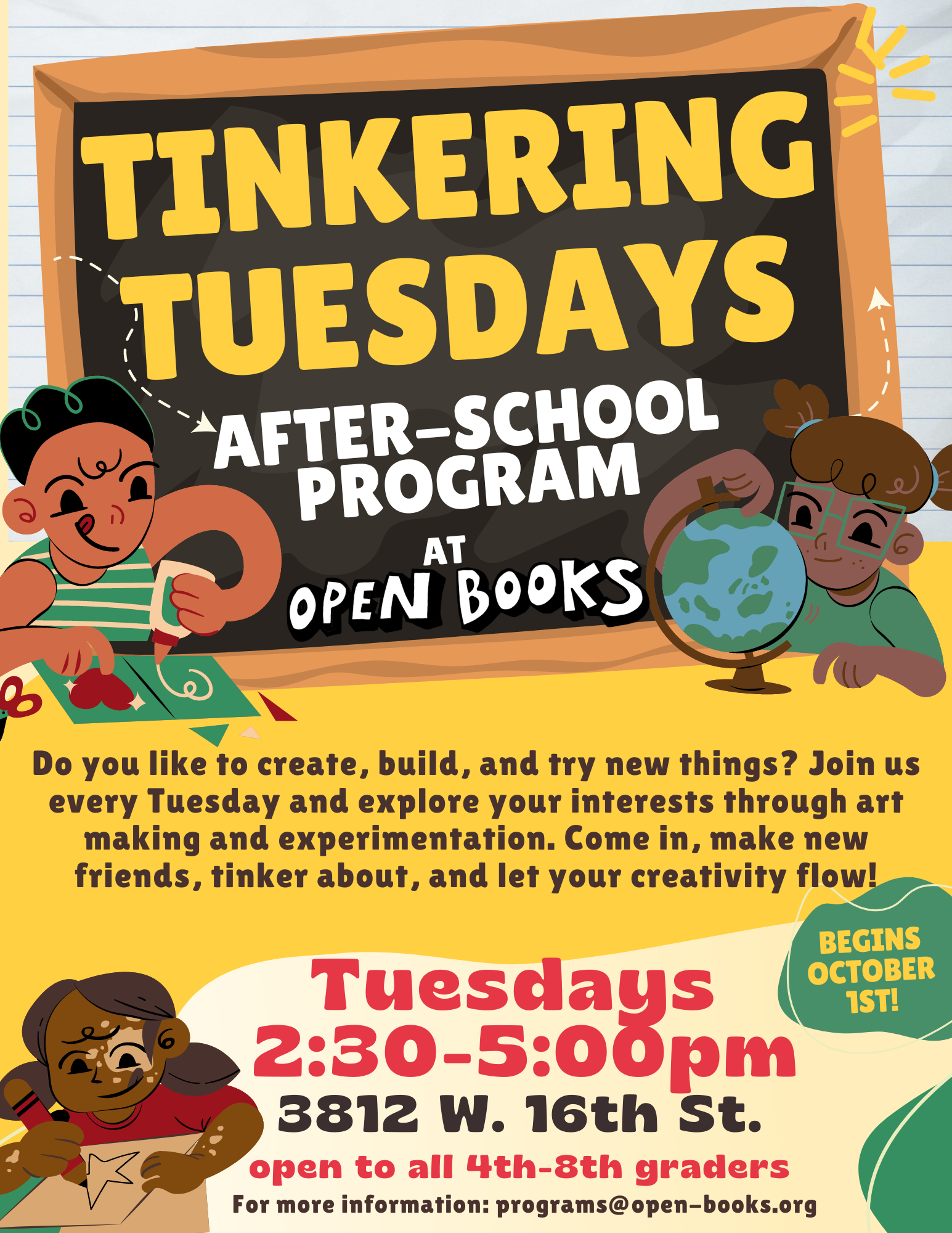 Join us after school at Open Books North Lawndale (3812 W 16th St. Chicago, IL 60623) for Tinkering Tuesdays! Open to all 4th-8th graders, this free drop-in program lets you explore your creativity through hands-on activities like art making, creative writing, letter beading, and more. Whether you want to tinker and build or write and create, there’s something for everyone. Come by, meet new friends, and express yourself on Tuesdays from 2:30-5pm.
